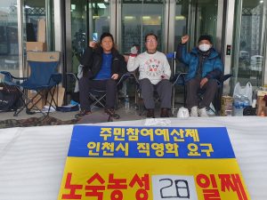 지난 11월 23일 월요일 인천시의회 기획행정위원회에서 인천주민참여예산지원센터 민간위탁 보고가 있었고, 인천참언론시민연합은 말썽 많은 인천주민참여예산센터를 시가 직접 운영하라며 20일 넘게 노숙 투쟁 가운데서 이날 인천시의회 청사 앞에서 센터 시 직영 촉구 기자회견을 가졌다.