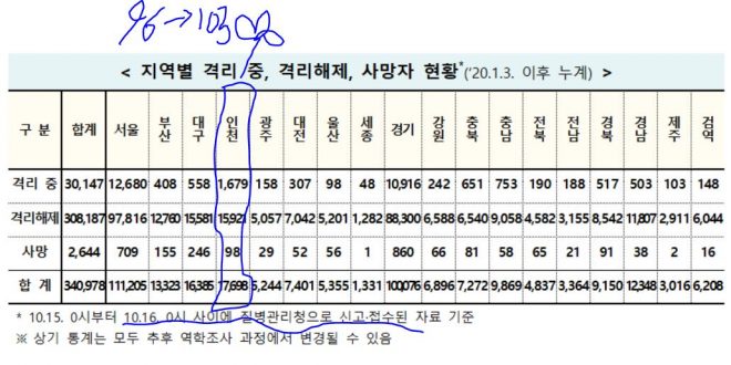 - [2021/10/16/0]코로나19인천지수: 확진17,698명*(103명:해외0명,지역103명),격리1,679명(-77명),완치퇴원15,921명(178명),사망98명(2명)