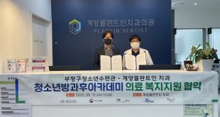 by 정재환 기자 부평구청소년수련관 청소년방과후아카데미는 지난 11일 계양플란트인치과와 청소년의 의료 복지지원 협약을 진행했다. 이번 협약은 방과후아카데미 청소년을 대상으로 구강검진, 불소, 구강 치료, 충치예방 교육, 상담 등 의료 복지서비스를 지원하고자 마련했다. 협약을 통해 방과후아카데미 대상자인 초등학생 4~6학년 청소년들은 계양플란트인치과의 의료 복지 지원인 전문적인 치과 구강 검진 및 치료 서비스 등 개인별 …