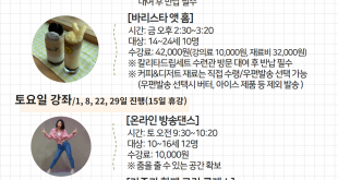 by 정재환 기자 부평구청소년수련관이 오는 29일까지 지역 청소년과 가족을 대상으로 온라인 교육문화 강좌 신청 접수를 받는다. 이번 온라인 강좌는 코로나19로 대면강좌가 어려워짐에 따라 교육문화의 기회가 단절된 청소년 및 가족을 위해 마련된 것으로, 8월 한 달 동안 진행된다. 생활체육 2강좌와 평생교육 2강좌가 개설되며, 집에서 배우는 SNPE 바른자세 척추운동, 온라인 방송댄스, 바리스타 …