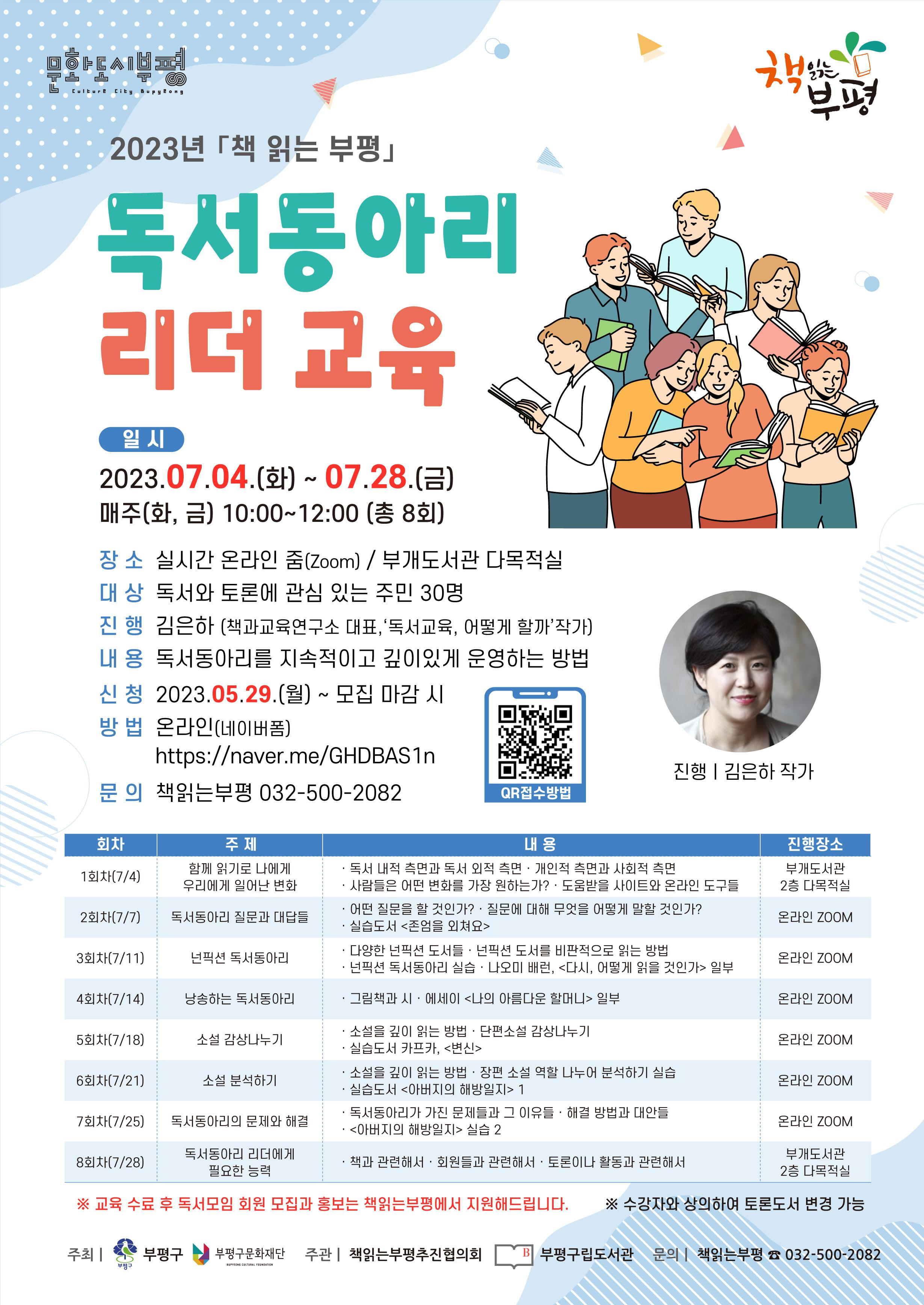 by 김성화 기자 부평구립도서관은 6월 30일까지 ‘독서동아리 리더교육’에 참여할 참가자를 모집한다. 교육 대상은 독서모임을 운영 중이거나, 신규 동아리를 기획하는 지역 주민이다. 교육은 오는 7월4일부터 화요일과 금요일 주 2회 오전 10시에 총 8회차로 진행될 예정이다. 교육은 책과교육연구소 대표이자 ‘독서교육, 어떻게 할까’, ‘처음 시작하는 독서동아리’ 등 다수의 관련 저서를 출간한 김은하 작가가 …