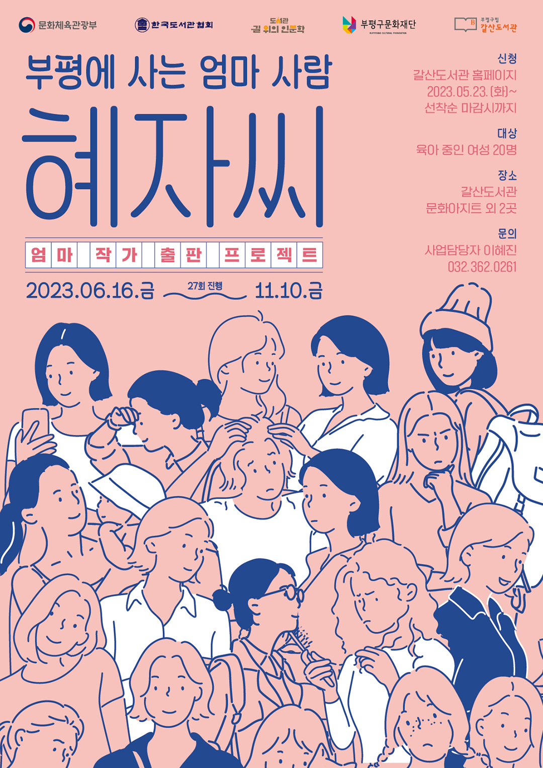 by 김성화 기자 갈산도서관은 6월 16일까지 문화체육관광부가 주최하고 한국도서관협회가 주관하는 ‘2023년 도서관 길 위의 인문학’ <부평에 사는 엄마 사람 혜자씨> 프로그램 참여자를 모집한다. 이번 프로그램은 육아에 집중된 일상을 벗어나 여성으로서의 자신을 성찰하기 위한 목적으로 기획됐다. 참여자는 프로그램을 통해 온전한 ‘나’로 살아가기 위한 작은 변화와 실천의 기록을 한 권의 에세이로 엮어 …