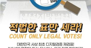 by 이장열 편집인 6월 28일 인천지방법원 501호에서 지난 21대 총선의 연수을 투표 결과에 대해 재검표한다. 최근 24일 대법원 특별2부(주심 천대엽 대법관)는 오는 28일 인천지법에서 민경욱 전 의원이 연수구선거관리위원회를 상대로 제기한 인천 연수을 총선 무효 소송 검증기일을 열기로 결정했다. 이번 재검표 및 투표지 검증은 작년 4·15 총선에 대하여 제기된 역대 최다인 130건 이상의 총선 …