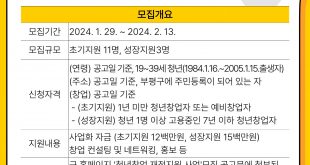 by 정재환 기자 부평구(구청장 차준택)가 오는 29일부터 다음 달 13일까지 2024년 ‘청년창업 재정지원 사업’의 참여자를 모집한다. ‘청년창업 재정지원 사업’은 성장 가능성이 높은 청년 창업자를 발굴해 사업화자금을 지원하는 사업이다. 모집 대상은 공고일 기준 부평구에 거주하는 19~39세 청년이다. 초기지원 부문 11명, 성장지원 부문 3명 등 총 14명을 선정할 예정이다. 초기지원 부문에서는 창업 …