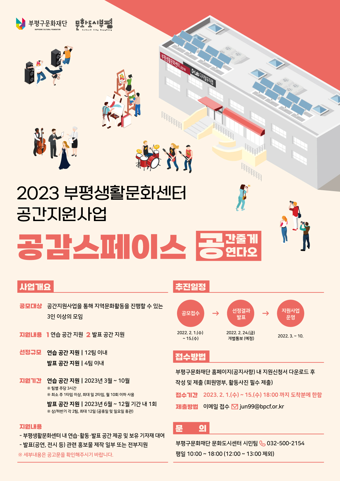 Read More »부평구문화재단, 시민문화 모임 공간 지원 사업 ‘공감스페이스’ 신청 접수
