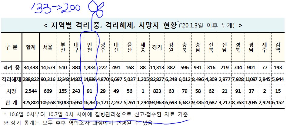 [2021/10/07/0]코로나19인천지수: 확진16,764명*(전일대비 추가 200명:지역감염 198명, 해외유입 2명) * 사망 추가 1명(총91명) [2021/10/07/0]코로나19인천지수: 확진16,764명*(200명:해외2명,지역198명),격리1,834명(123명),완치퇴원14,839명(76명),사망91명(1명) [전국] 코로나19 사망: 전일대비 추가 8명(누적 2,544명, 치명율 0.78%). 2020. 1. 3. 이후. [질병관리청]