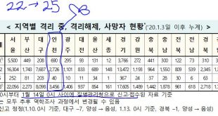 Read More »[2021/01/13/0시] 확진3,431명*(22명:해외2명,지역20명),격리725명(-20명),완치퇴원2,666명(40명),사망40명(2명)