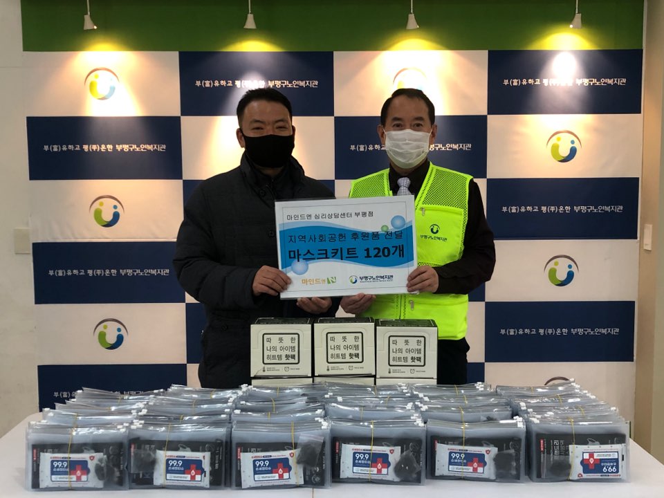 by 정재환 기자 부평구노인복지관(관장 최민수)은 마인드엔 심리상담센터(대표 김성태)로부터 마스크 종합키트(120개)를 전달 받았다고 29일 밝혔다. 김성태 대표는 “최근 코로나19가 재유행하고 있는 상황에서 어르신들이 가장 먼저 실천할 수 있는 방역수칙은 마스크 착용일 것” 이라며 “많지 않은 수량이지만 조금이나마 어르신들에게 도움을 드리고 싶었다.”고 밝혔다. 전달받은 물품은 복지관에서 매주 도시락을 만들어서 전달하는 결식우려대상자 120명에게 …