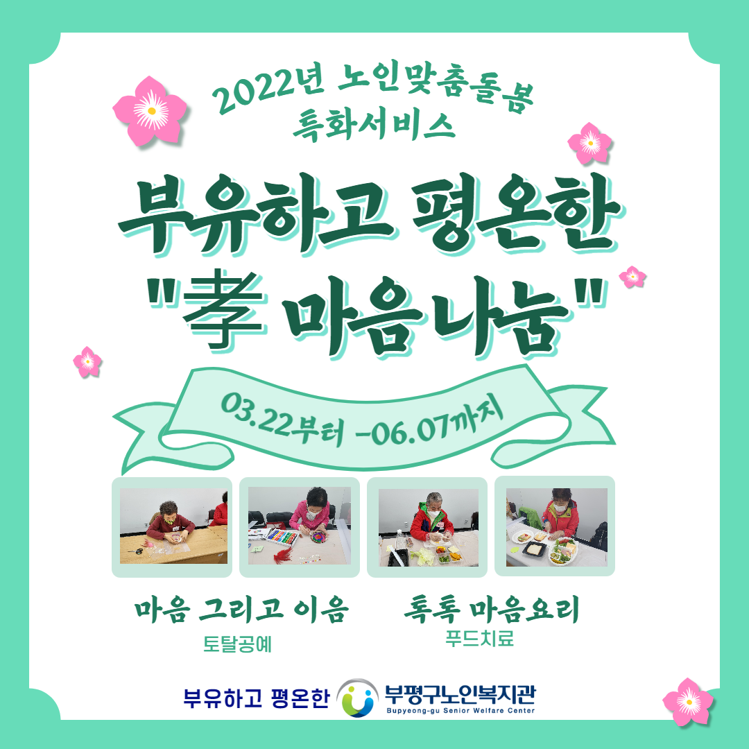 by 김성화 기자 부평구노인복지관은 오는 6월 7일까지 주별 3회씩 취약계층 어르신을 대상으로「孝 마음 나눔」이라는 주제로 미술치료인 ‘마음 이음’과 푸드 예술치료인 ‘톡톡 마음요리’를 진행한다고 밝혔다. 특화서비스인「孝 마음 나눔」은 노인이 집단 활동 내에서 다양한 상호작용을 유도할 수 있도록 연령, 성별, 건강상태 등을 고려하여 진행하여 정신건강에 대한 인식 개선과 사회관계가 향상되도록 기획하였다. ▷미술치료인 …