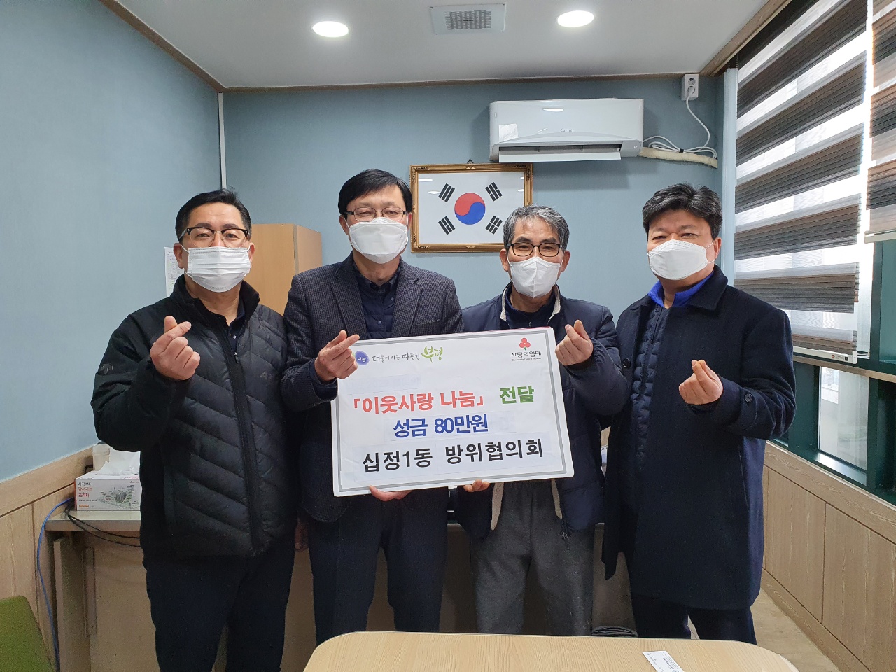 by 정재환 기자 십정1동은 지난 24일 십정1동 방위협의회로부터 이웃돕기 성금 80만 원을 기탁 받았다. 십정1동 방위협의회는 코로나19로 힘든 시간을 보내는 이웃을 위해 성금을 전달하기로 결정했다. 황병탁 십정1동 방위협의회장은 “모두가 어려운 상황이지만 이런 때일수록 주변을 돌아보고 나누는 것이 이웃을 위한 배려”라며 “어려운 분들에게 조금이나마 도움이 되길 바란다”고 전했다. 박종한 십정1동장은 “우리 …