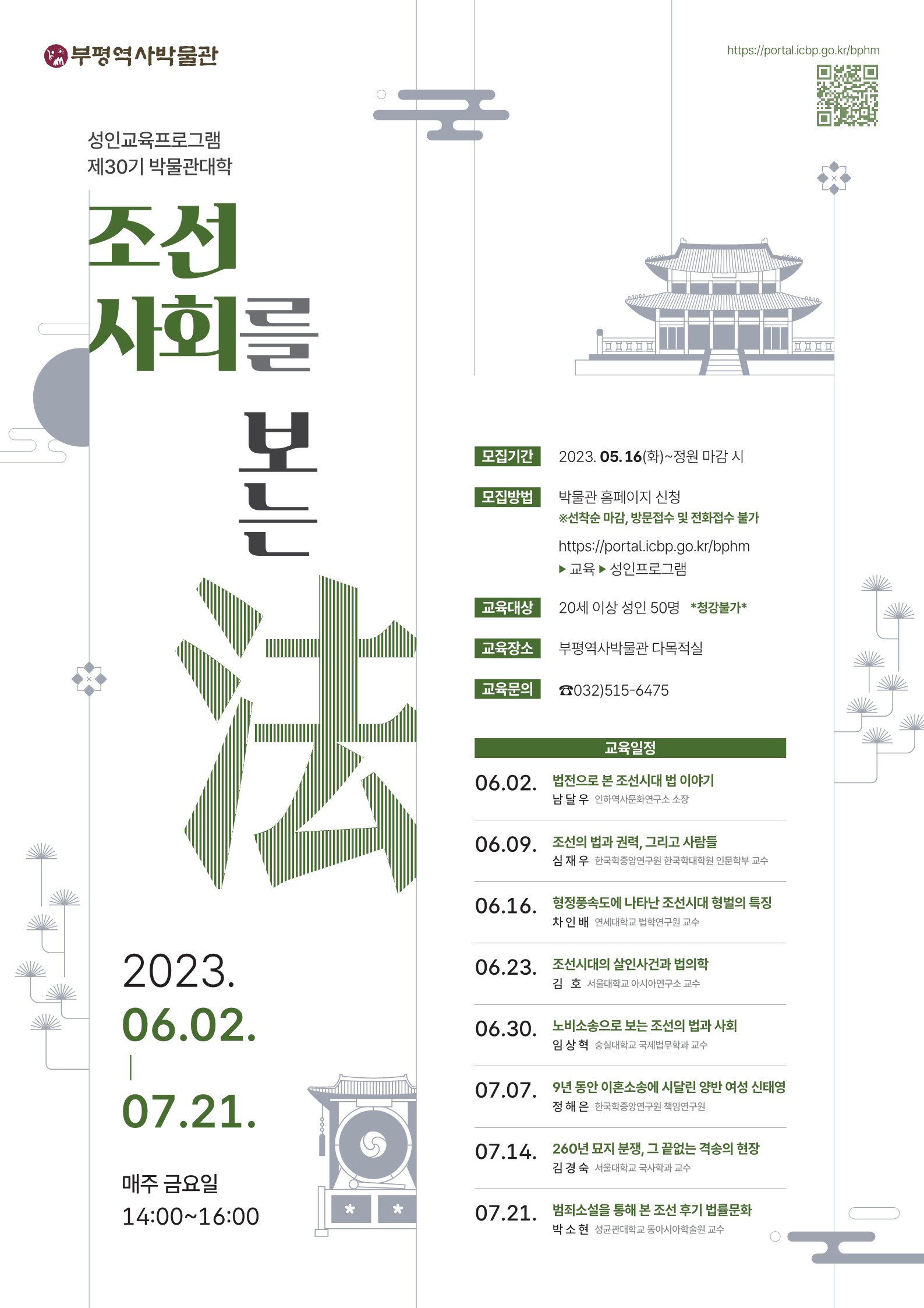 Read More »‘조선사회를 보는 法’, ‘제30기 박물관대학’ 참여자 모집..부평역사박물관