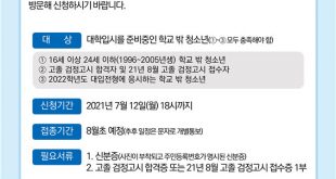 by 이장열 편집인 부평구청소년지원센터 꿈드림(이하 부평구 꿈드림)은 7월 12일까지 대입을 준비하는 관내 학교 밖 청소년들에게 코로나19 백신접종 신청을 받고 있다. 대상자는 고졸 검정고시 합격자 및 2021년 8월 고졸 검정고시 접수자 중 2022학년도 대입전형에 응시하는 부평구의 학교 밖 청소년으로 16세 이상 24세 이하(1996~2005년생)의 연령층이 해당된다. 다만 한국교육과정평가원의 2022학년도 대학수학능력시험 모의평가 접수자 …