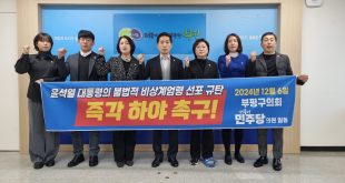 이기현 기자 국민에게 총칼 겨눈 윤석열 대통령 즉각 퇴진 요청 대한민국 민주주의와 헌정질서를 지키기 위해 즉시 탄핵 필요 6일 부평구의회 민주당 구의원들이 오전 9시 부평구청 2층 브리핑룸에서 성명서를 내고 계엄령 선포와 관련된 ‘윤석열 대통령 즉각 하야’를 촉구하고 나섰다. 이들은 성명서에서 “윤석열 대통령은 위헌적 계엄을 선포했다.”며 “국민이 아닌 개인의 안위를 위한 …