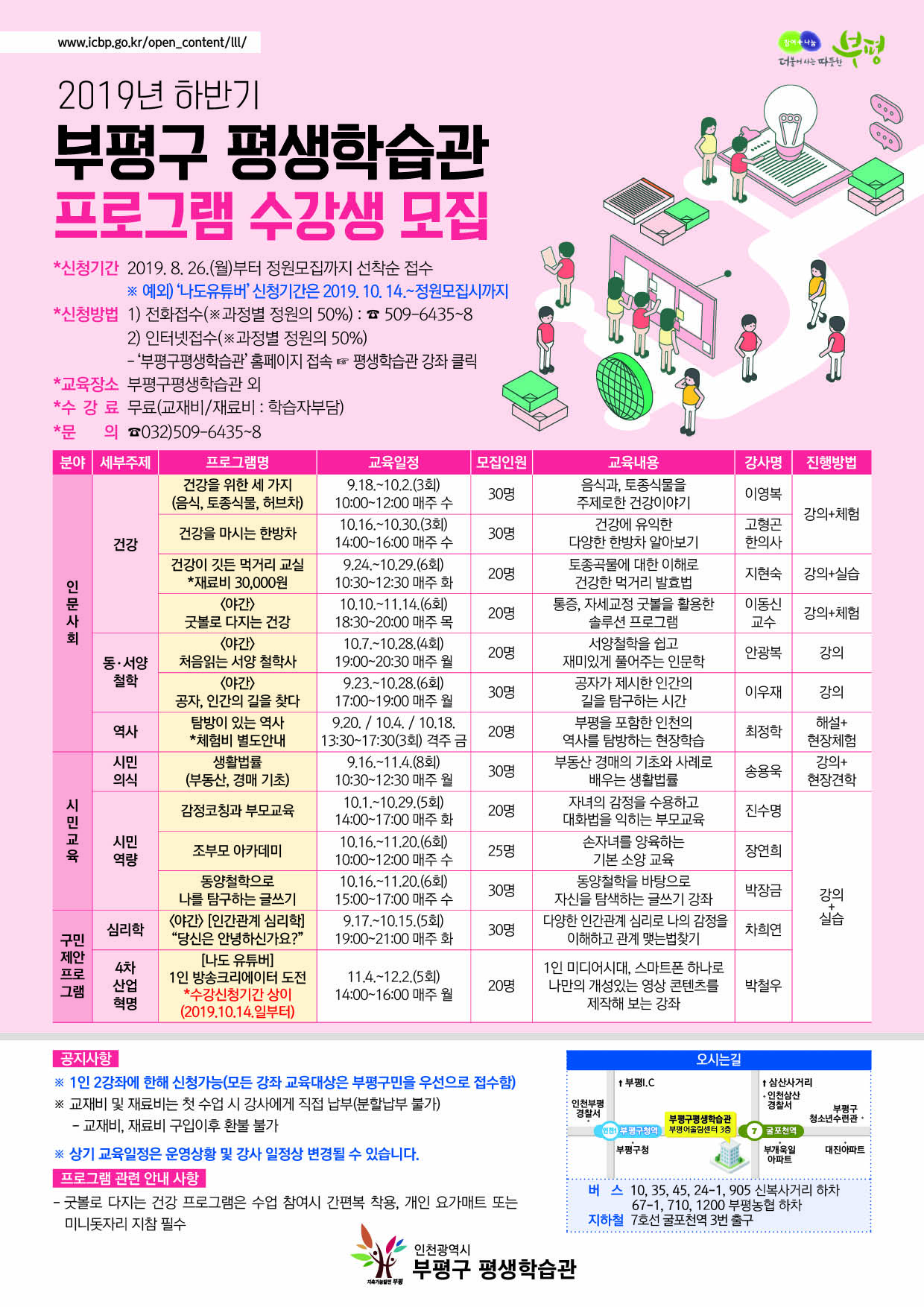 Read More »[부평 문화] 부평구 평생학습관, 2019년 하반기 평생교육 프로그램 수강생 모집