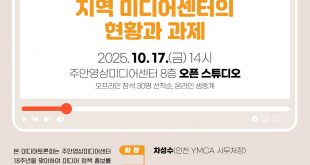 김성화 기자 10월 17일 터 오픈 스튜디오에서 주안영상미디어센터가 오는 10월 17일 오후 2시, 센터 오픈 스튜디오에서 ‘미디어 테이블: 지역 미디어센터의 현황과 과제’ 토론회를 개최한다. 이번 행사는 지역 미디어센터의 지속 가능한 발전 방향을 모색하기 위한 중요한 논의의 장이 될 것으로 기대된다. 올해로 네 번째를 맞이하는 ‘미디어 테이블’은 미디어와 사회의 주요 현안을 …