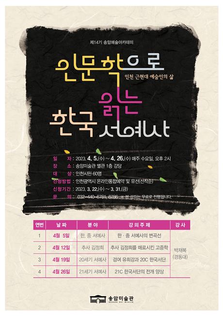 by 이장열 편집인 송암미술관에서 오는 4월 5일(수)부터 일반인 대상의 미술사 강좌인 송암예술아카데미를 개설한다. 이번 강좌는 20세기를 살았던 인천의 근현대 예술가들의 삶을 조명했던 지난 12기의 후속 강좌로 한국 서예사를 주제로 열린다. 인천은 동국 진체를 완성한 원교 이광사를 필두로 검여 유희강, 동정 박세림, 남전 원중식까지 한국을 대표하는 서예가를 배출한 곳이다. 송암미술관에서는 총 …