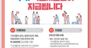 by 이장열 편집인 인천시는 코로나19로 생계가 어려워진 저소득층의 가계 부담 완화를 위해 한시적으로 188,040여명에게 1인당 10만원의 ‘저소득층 추가 국민지원금’을 8월 24일에 일괄 지급한다고 밝혔다. 5차 재난지원금(국민상생지원금)과는 별도로 지급되는‘저소득층 추가 국민지원금’의 지급대상자는 기초생활 수급자, 법정 차상위 계층, 아동양육비 지원 한부모가족 등으로 이 중 계좌정보 확인이 필요 없는 기초생활보장 생계․주거급여 수급자, 차상위장애인[차상위 …