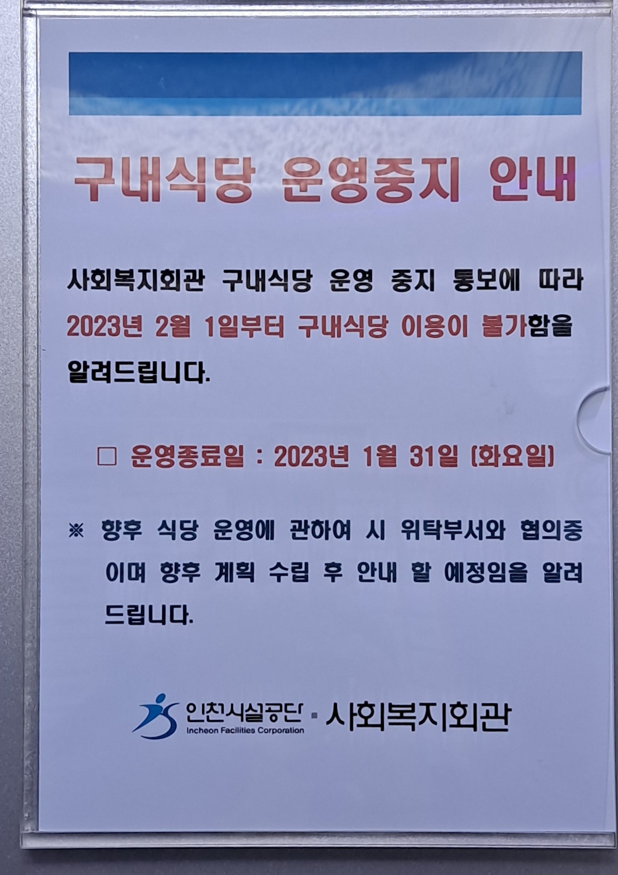 Read More »인천사회복지회관 구내식당 폐쇄, 장애인 큰 불편…인천시설관리공단 위탁 업무 소홀