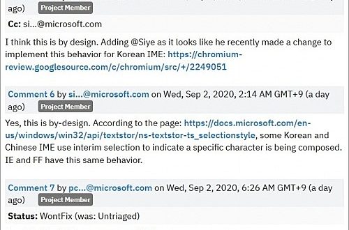 마아크로소프트 개발자는 “한국어나 중국어 작성 도중 문자가 미완성 상태라는 것을 알려주기 위해 배경에 상자가 나타나도록 하는 것이 윈도우 표준 UI이며 이런 표시는 인터넷 익스플로러와 파이어폭스도 동일하다”는 설명입니다.