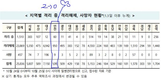 [10/25/0시]코로나19인천지수: 확진1,019명(전일대비 추가 0명) 확진1,019명(0명:해외0명,지역0명),격리60명(-5명),완치퇴원950명(5명),사망9명(-)