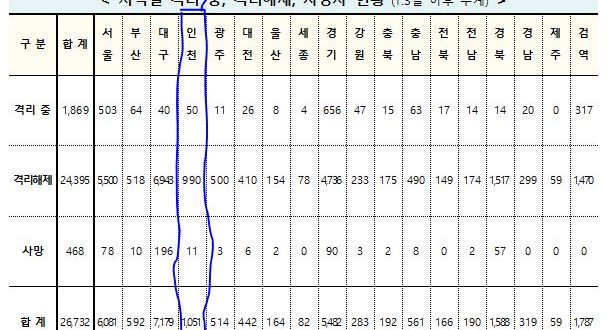 [11/2/0시]코로나19인천지수: 확진1,051명(전일대비 추가 2명: 지역감염 2명, 해외유입 0명) 확진1,051명(2명:해외0명,지역2명),격리50명(-2명),완치퇴원990명(4명),사망11명(-) [질병관리청]