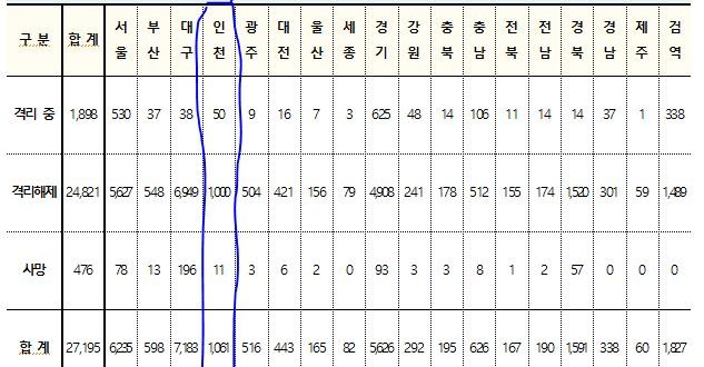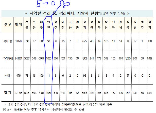 [11/06/0시]코로나19인천지수: 확진1,061명(전일대비 추가 0명) 확진1,061명(0명:해외0명,지역0명),격리50명(-2명),완치퇴원1,000명(2명),사망11명(-) [질병관리청]