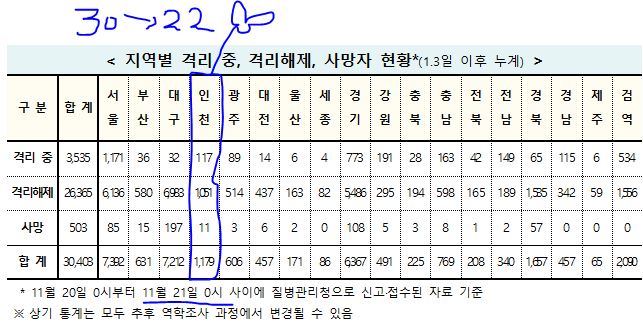 [11/21/0시]코로나19인천지수: 확진 1,1779(전일대비 추가 22명: 지역감염 22명, 해외유입 0명) 확진1,179명(30명:해외0명,지역22명),격리117명(8명),완치퇴원1,051명(4명),사망11명(-) [질병관리청]
