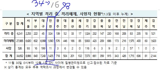 [12/01/0시]코로나19인천지수: 확진1,425명*(전일대비 16명 추가: 지역감염16명, 해외유입 0명) 확진1,425명*(16명:해외0명,지역16명),격리324명(10명),완치퇴원1,090명(6명),사망11명(-) [질병관리청]