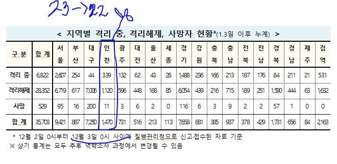 [12/03/0시] 코로나19인천지수: 확진1,470명*(전일대비 추가 22명: 지역감염 22명, 해외유입 0명) 확진1,470명*(22명:해외0명,지역22명),격리339명(5명),완치퇴원1,120명(12명),사망11명(-) [질병관리청]