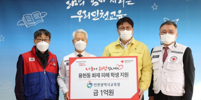 인천시교육청은 학교 교직원들이 용현동 화재 피해 초등학생을 돕기 위해 모은 성금 1억 21만 원을 적십자사 인천지회에 전액 기부했다고 8일 밝혔다.