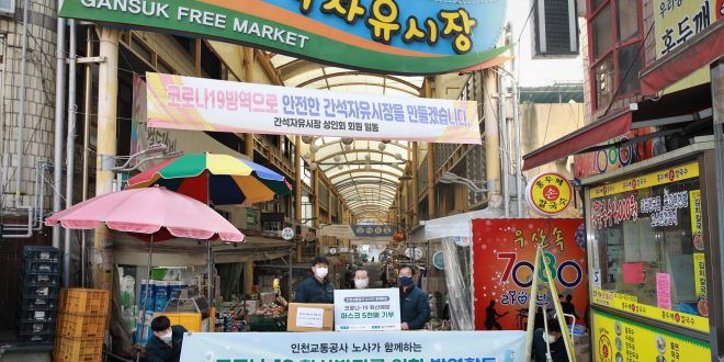 22일 인천교통공사(사장 정희윤)는 코로나19 확산 방지를 위해 자매결연 전통시장 간석자유시장을 방문하여 노사가 공동으로 소독방역 봉사활동을 전개했다고 밝혔다.