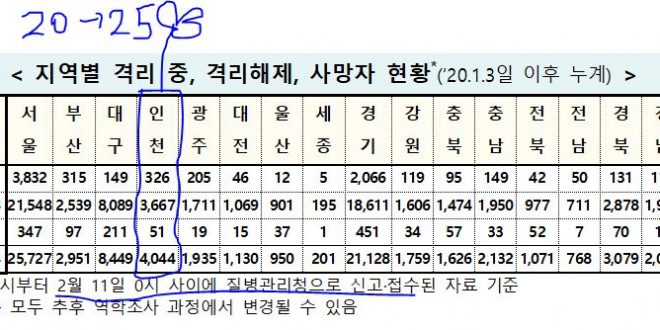 [2021/02/11/0시]코로나19인천지수: 확진4,044명*(전일대비 추가 25명: 지역감염 25명, 해외유입 0명) 확진4,044명*(전일대비 추가 25명:해외0명,지역25명),격리326명(12명), 완치퇴원3,667명(13명),사망51명(-) 인천 임시선별검사소(8군데) 익명 누적 확진자: 총 337명(전일대비 추가 3명). - 2020. 12. 15. 검사시작. [질병관리청]
