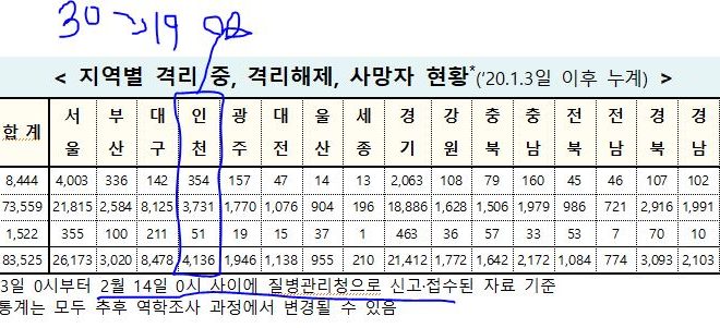 [2021/02/14/0시]코로나19인천지수: 확진4,136명*(전일대비 추가 19명:지역감염 19명, 해외유입 0명) 확진4,136명*(19명:해외0명,지역19명),격리354명(-12명),완치퇴원3,731명(31명),사망51명(-) 인천 임시선별검사소(8군데) 익명 누적 확진자: 총 352명(전일대비 추가 0명) - 2020. 12. 15. 검사시작. [질병관리청]