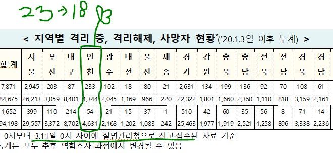 [2021/03/11/0시]코로나19인천지수: 확진4,631명*(전일대비 추가 18명:지역감염 18명, 해외유입 0명) 확진4,631명*(18명:해외0명,지역18명),격리233명(-6명),완치퇴원4,344명(24명),사망54명(-) 인천 임시선별검사소(6군데) 누적 확진자: 총 388멸ㅇ(전일대비 추가 1명). 2020. 12. 15. 검사시작. [질병관리청]