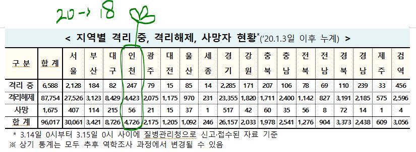 [2021/03/15/0시] 확진4,726명*(전일대비 추가 18명:지역감염 18명, 해외유입 0명) *사망 추가 1명(총56명) 확진4,726명*(18명:해외0명,지역18명),격리247명(8명),완치퇴원4,423명(9명),사망56명(1명) 인천 임시선별검사소(6군데) 누적 확진자: 총 397명(전일대비 추가 4명). 2020, 12. 15. 검사시작. [질병관리청]