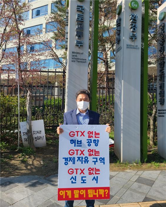 이 위원장은 이날 세종시 국토교통부 청사 앞에서 피켓 시위에 돌입하면서 “오는 6월이면 국가철도망 계획이 확정되고, 4월 말 청문회가 예정돼 있는데 일각에서 일고 있는 GTX-D 노선 포함 불투명설을 차단하고 GTX-D 노선 건설을 확실히 하고자 행동에 나서게 됐다“고 설명했다.