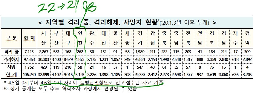 [2021/04/06/0시]코로나19인천지수: 확진5,193명*(전일대비 추가 27명:지역감염 27명, 해외유입 0명) *사망 추가 1명(총57명) 확진5,193명*(27명:해외0명,지역27명),격리262명(-15명),완치퇴원4,873명(41명),사망58명(1명) 인천 임시선별검사소(6군데) 누적 확진자: 455명(전일대비 추가 3명). 2020. 12. 15. 검사시작. [질병관리청]