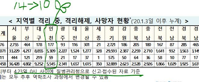 [2021/04/23/0시] 확진5,545명*(전일대비 추가 10명:지역감염 10명, 해외유입 0명) 확진5,545명*(10명:해외0명,지역10명),격리177명(-22명),완치퇴원5,309명(32명),사망59명(-) 인천 임시선별검사소(6군데) 누적 확진자: 총 505명(전일대비 추가 4명). 2020. 12. 15. 검사시작. [질병관리청]