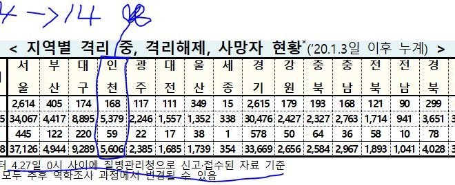 [2021/04/27/0시]코로나19인천지수: 확진5,606명*(전일대비 추가 14명:지역감염 14명, 해외유입 0명) 확진5,606명*(14명:해외0명,지역14명),격리168명(-2명),완치퇴원5,379명(16명),사망59명(-) 인천 임시선별검사소(6군데) 누적 확진자: 총513명(전일대비 추가 1명). 2020. 12. 15. 검사시작.[질병관리청]