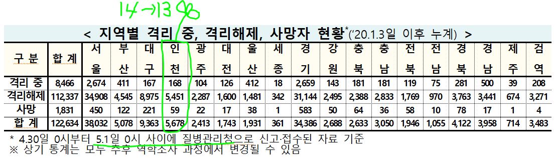[2021/05/01/0시]코로나19인천지수: 확진5,678명*(전일대비 추가 13명:지역감염 13명, 해외유입 0명) 확진5,678명*(13명:해외0명,지역13명),격리168명(-3명),완치퇴원5,451명(16명),사망59명(-) 인천 임시선별검사소(6군데) 누적 확진자: 총 521명(전일대비 추가 3명). [질병관리청]
