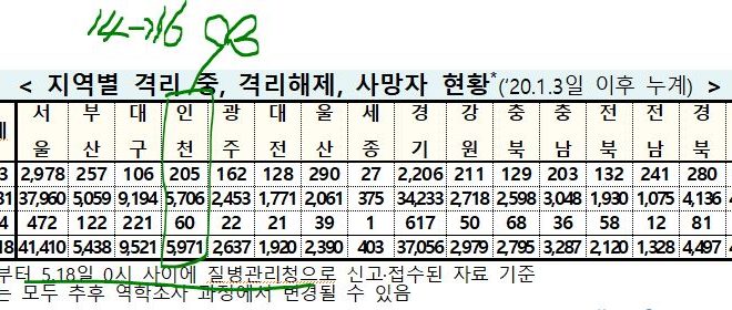 [2021/05/18/0시]코로나19인천지수: 확진5,971명*(전일대비 추가 16명:지역감염 16명, 해외유입 0명) 확진5,971명*(16명:해외0명,지역16명),격리205명(-4명),완치퇴원5,706명(20명),사망60명(-) 인천 임시선별검사소(6군데) 누적 확진자: 총 562명(전일대비 추가 2명)