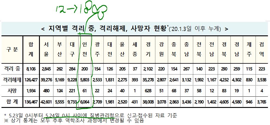 [2021/05/24/0시]코로나19인천지수: 확진6,064명*(전일대비 추가 18명:지역감염 18명, 해외유입 0명) 확진6,064명*(18명:해외0명,지역18명),격리200명(-),완치퇴원5,803명(18명),사망61명(-) [질병관리청]