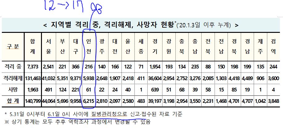[2021/06/01/0시]코로나19인천지수: 확진6,215명*(전일대비 추가 17명:지역감염 16명, 해외유입 1명) 확진6,215명*(17명:해외1명,지역16명),격리216명(3명),완치퇴원5,938명5,924명(14명),사망61명(-) [질병관리청]