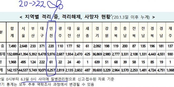 [2021/06/03/0시]코로나19인천지수: 확진6,257명*(전일대비 추가 22명:지역감염 22명, 해외유입 0명) 확진6,257명*(22명:해외0명,지역22명),격리220명(2명),완치퇴원5,976명(20명),사망61명(-) [질병관리청]