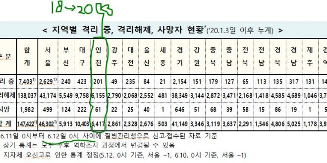 [2021/06/12/0시]코로나19인천지수: 확진6,417명*(전일대비 추가 20명:지역감염 19명, 해외유입 1명) 확진6,417명*(20명:해외1명,지역19명),격리201명(-4명),완치퇴원6,155명(24명),사망61명(-) [질병관리청]