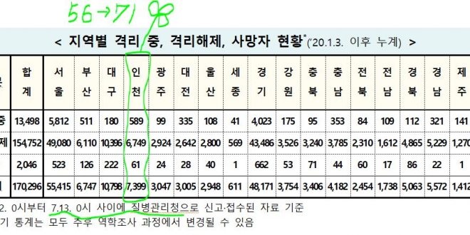 [2021/07/13/0]코로나19인천지수: 확진7,399명*(전일대비 추가 71명:지역감염 67명, 해외유입 4명) 확진7,399명*(71명:해외4명,지역67명),격리589명(47명),완치퇴원6,749명(24명),사망61명(-) 코로나19 관련 사망: 전일대비 추가 2명(누적 2,046명). 2020. 1. 3 이후 (치명율: 1.2%) [질병관리청]