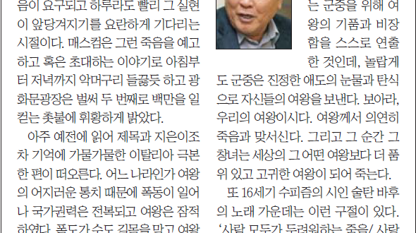 이 작가는 또 “매스컴이 숫자까지 암시하며 불러 모은 숫자가, 초등학생·중학생 유모차에 탄 아기며 들락날락한 사람까지 모두 헤아려 만든 주최 측 주장 인원수가…”라면서 “(북한)아리랑 축전에서와 같은 거대한 집단 체조의 분위기…으스스한 느낌마저”라며 비난했다.