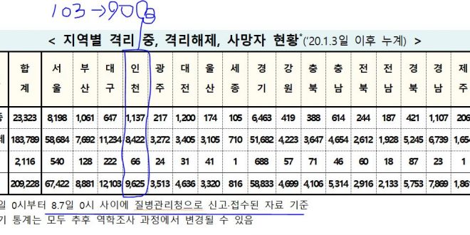 [2021/08/07/0]코로나19인천지수: 확진9,625명*(전일대비 추가 90명:지역감염 90명, 해외유입 0명) 확진9,625명*(90명:해외0명,지역90명),격리1,137명(14명),완치퇴원8,422명(76명),사망66명(-) [전국] 코로나 19 백신 관련 사망: 전일대비 추가 0명(누적448명). 2021. 2. 26. 이후 [전국] 코로나19 사망 : 전일대비 추가 3명(누적 2,116명, 치명율 1.01%). 2020. 1. 3. 이후. [질병관리청]