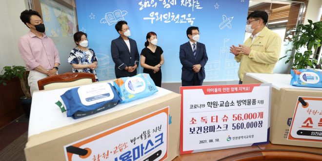 10일 인천시교육청은 인천학원연합회 회장과 임원들이 참석한 가운데 「코로나-19 예방을 위한 학원 및 교습소 방역물품 지원 전달식」’을 가졌다. 이번 방역물품 지원은 방학기간 중 학원 및 교습소 밀집도 증가에 따른 방역강화를 위해 이루어졌다.