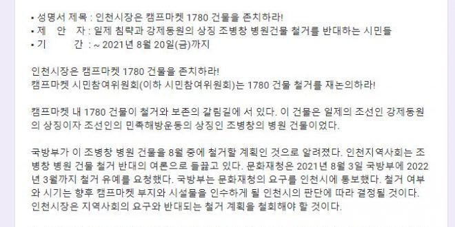 최근 청와대 청원까지 불러 온 조병창 병원 건물 철거에 대해서, 부평 시민들이 인천시장이 직접 나서서 철거 결정을 철회를 요구하는 서명 운동을 12일 시작했다.